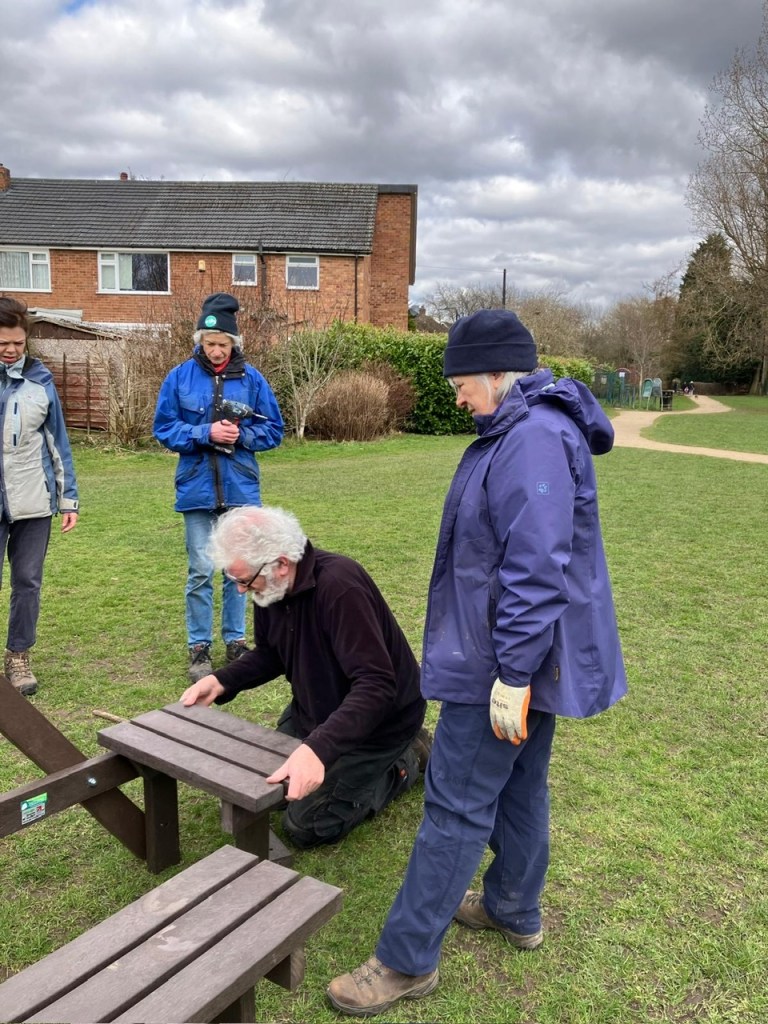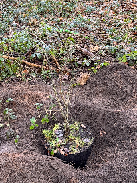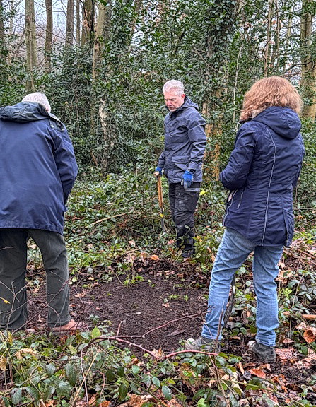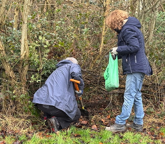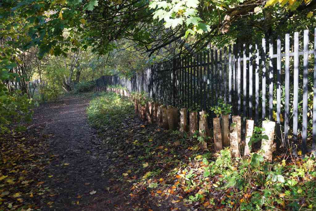 Trafford Wildlife Volunteers getting ready to start work and saplings planted by The Conservation Trust along the perimeter fence in November 2023